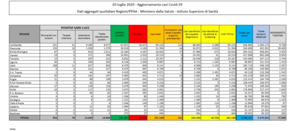 Coronavirus Italia – Sono 223 i nuovi casi di Coronavirus comunicati dal Ministero della Salute nel bollettino di oggi, venerdì 3 luglio 2020. Si tratta di 22 nuove positività riscontrate rispetto alla giornata di ieri.
