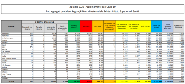 Secondo il bollettino del 21 luglio 2020 sono dunque 197.431 i dimessi guariti (+269), 35.073 i deceduti (+15) e 244.752 i casi totali. Gli attualmente positivi passano da 12.404 a 12.248, in calo di 156 unità.