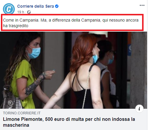 Ennesimo attacco a Napoli e al popolo napoletano. Questa volta ci pensa il Corriere della Sera, che nel commento all’articolo riguardante l’obbligo di mascherina in un paesino piemontese, tira in ballo la Campania. “Come in Campania. Ma a differenza della Campania, qui nessuno ancora ha trasgredito“.