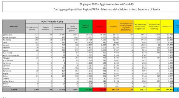 GIUGNO – Nuova grafica del bollettino a giugno. Un mese dopo, il 28 giugno, la situazione è la seguente: 4.665 positivi, 4.071 guariti e 431 decessi. 39 le persone ricoverate con sintomi, 0 quelle in terapia intensiva, 124 in isolamento domiciliare. 163 gli attualmente positivi, per un totale di 4.665 casi. Il 12 giugno la Campania fa un ricalcolo sottraendo 230 unità. Rispetto al mese precedente, si segnalano quindi 21 decessi in più, l’azzeramento dei pazienti in terapia intensiva, -221 pazienti ricoverati e 716 guariti.