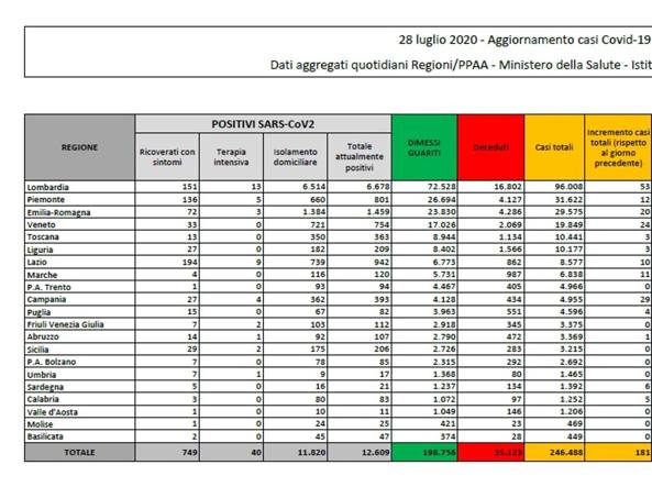 LUGLIO – In un mese si registra un incremento di casi. Sono 4.955 i nuovi positivi al covid-19 in Campania (+290 casi), 434 decessi (+3) e 4.128 guariti (+57). 27 le persone ricoverate con sintomi (-12 rispetto a giugno), 4 quelle in terapia intensiva (con un incremento di +4), 362 in isolamento domiciliare (+238). 393 gli attualmente positivi (+230) che quindi crescono a fronte anche del minor numero di persone guarite. Segno che i contagi sono in aumento anche a causa delle apertura e della mobilità tra nazioni diverse. Ma il numero di persone ricoverate non desta ancora preoccupazione, la maggior parte dei nuovi casi è infatti in isolamento presso la propria abitazione.