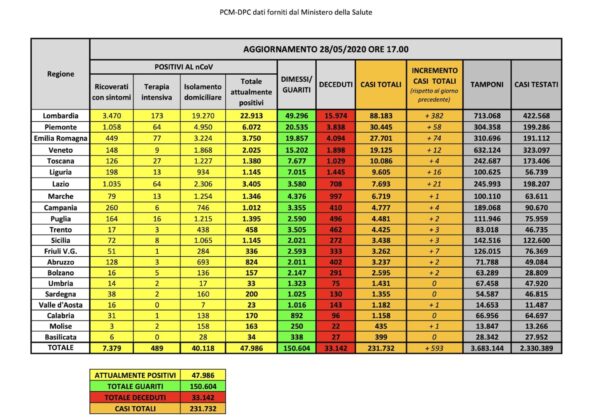 MAGGIO – Al 28 maggio, in Campania risultavano 4.787 positivi, 410 i deceduti e 3.355 i guariti. 260 le persone ricoverate con sintomi, 6 quelle in terapia intensiva, 746 in isolamento domiciliare. I dati del Ministero, aggiornati alle ore 18, portavano 4.777 casi totali di cui 1.012 gli attualmente positivi.