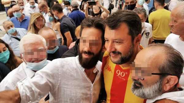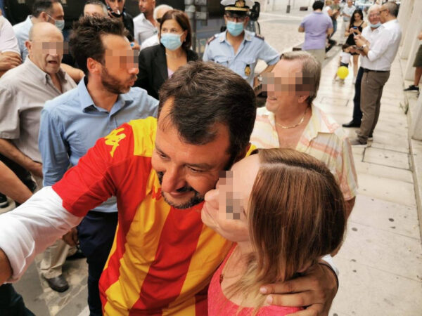 Salvini a Benevento, foto con una sostenitrice senza mascherina. I due arrivano quasi al bacio