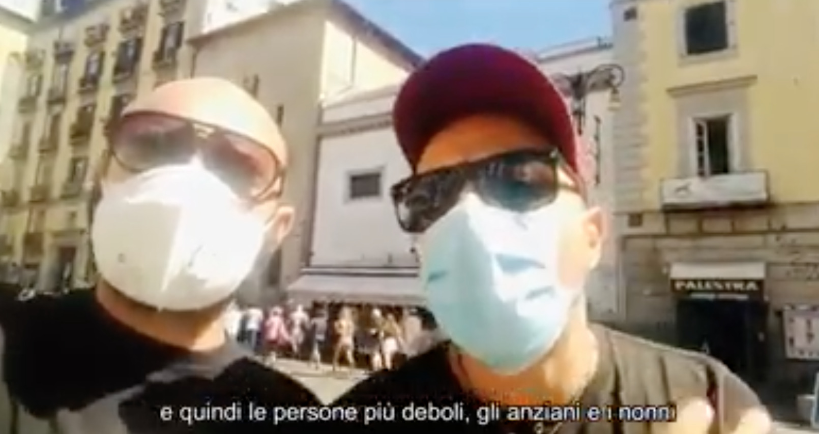 “Siccome il Covid sta colpendo anche chi è più giovane, e anche se molti sono asintomatici in questo modo si possono infettare i nostri cari, e quindi le persone più deboli come gli anziani e i nostri nonni, semplicemente stamm’c accort’. Noi sull’invito dell’Asl Napoli 2 Nord, vi stiamo facendo questo messaggio, sperann’ e ce verè ampress’ a un bel concerto e di stare assieme. Ciao uagliù”.