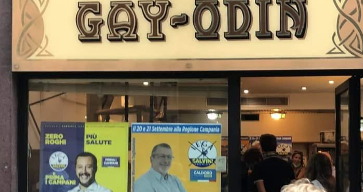 Questa mattina infatti alle 12.30 si è inaugurato il nuovo comitato elettorale di Maurizio Esposito, candidato con la Lega alle regionali in Campania. Come si legge sul suo profilo Facebook, ospiti nella nuova sede del Centro Direzionale, sono stati Stefano Caldoro e il Presidente di Campo Sud On. Marcello Taglialatela. Il locale è stato tappezzato di manifesti e locandine elettorali e come si vede dalla foto sui social era presente l’insegna ‘Gay Odin’.