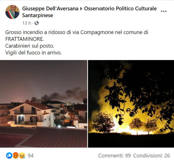 “Grosso incendio a ridosso di via Compagmone nel comune di FRATTAMINORE. Carabinieri sul posto. Vigili del fuoco in arrivo”.