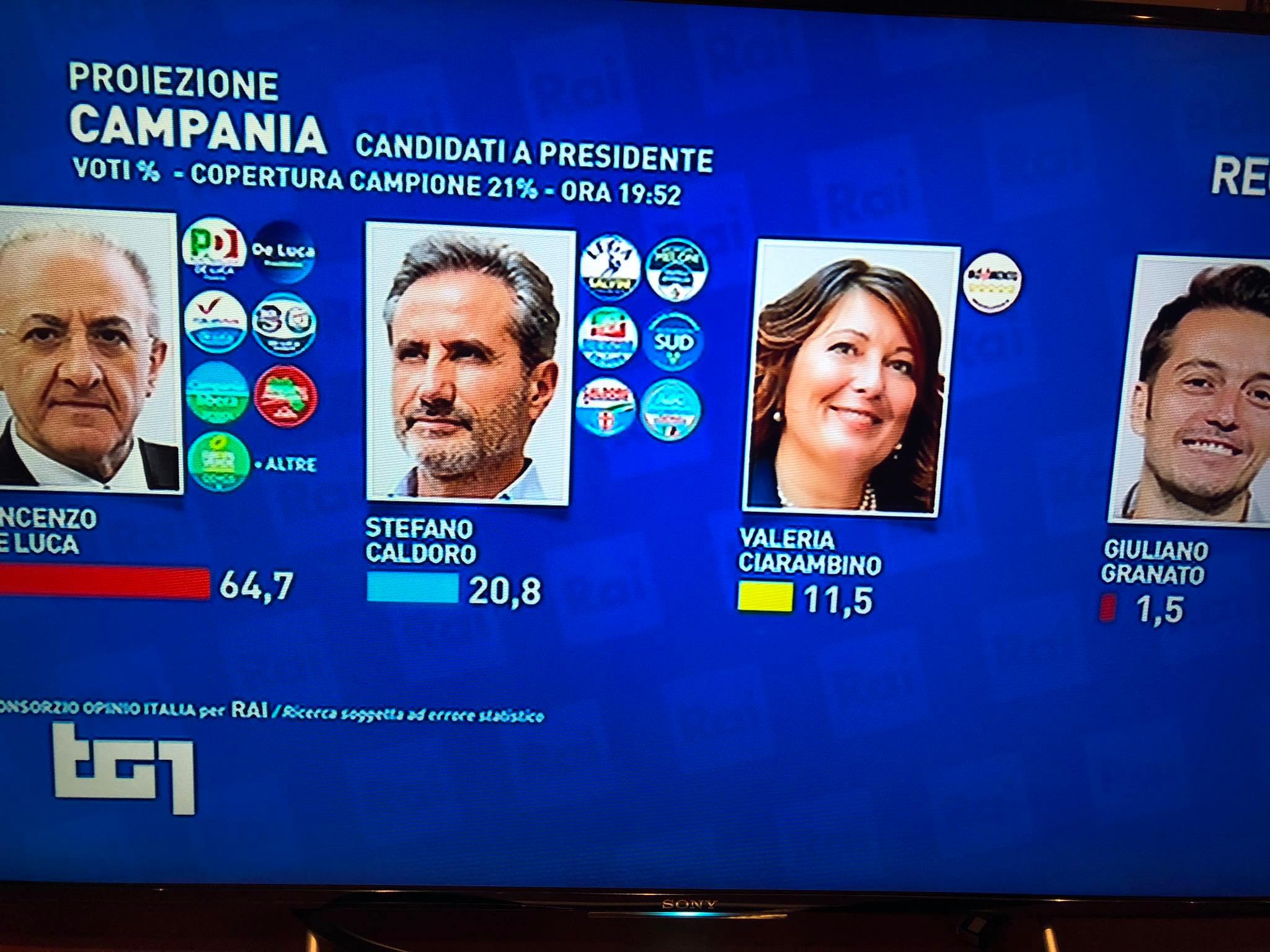 PRIMA PROIEZIONE – Prima proiezione in Regione Campania su una copertura totale ancora parziale, ferma al 9% aggiornata alle ore 17.23. I dati sono stati diffusi dal Consorio Opinio Italia per la Rai. Confermato il primo exit poll, in netto vantaggio è il governatore uscente Vincenzo De Luca.