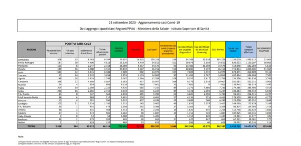 Il bollettino nazionale del 23 settembre 2020 conta 1.640 nuovi casi. Trend in rialzo, dunque, rispetto alla giornata di ieri, dovuto anche all’incremento di tamponi effettuati. Ciò stando ai dati riportati dal Ministero della Salute che quotidianamente aggiorna sui casi di positività al Coronavirus in Italia.