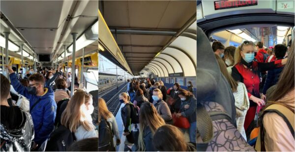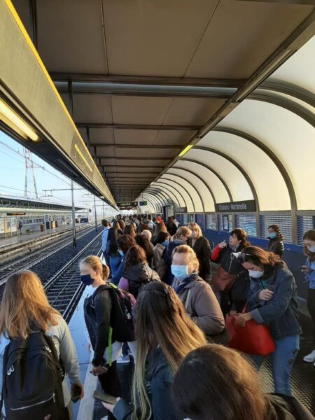 Stamattina una bella giornata, treno per Sorrento da via Nocera delle 7.54 passato alle 8.10, ora siamo fermi da venti minuti a Castellammare perché una signora ha chiamato le forze dell’ordine per sovraffollamento ma nessuno si vede“.