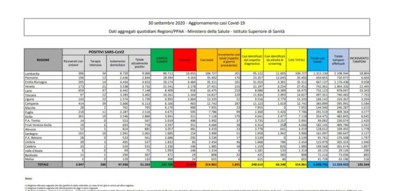 Il bollettino nazionale del 30 settembre 2020 conta 1.851 nuovi casi. Trend in rialzo, dunque, rispetto alla giornata di ieri, dovuto anche all’incremento di tamponi effettuati. Ciò stando ai dati riportati dal Ministero della Salute che quotidianamente aggiorna sui casi di positività al Coronavirus in Italia.
