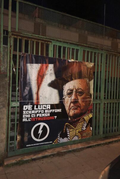 Napoli – Spuntano a Napoli, ma anche in altre città della Campania, delle gigantografie che contestano Vincenzo De Luca. Il blocco studentesco ha affisso nel capoluogo, a Nola ed a Salerno dei manifesti il cui il presidente della Regione Campania appare vestito da Sceriffo di Toy Story, con la scritta: “De Luca, Sceriffo buffone. Chi ci pensa all’Istruzione?”.