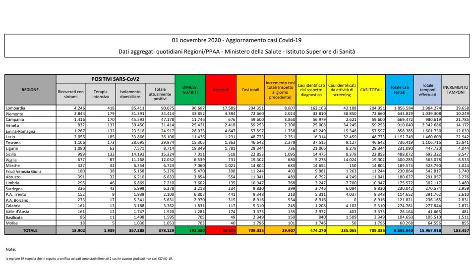 Coronavirus in Italia – Sono 29.907 i nuovi casi di coronavirus registrati secondo il bollettino di domenica 1 novembre 2020. Si tratta di un calo rispetto a ieri in termini assoluti, ma a fronte di circa 30mila tamponi in meno: 183.457 contro i circa 215mila di ieri. Come di consueto, infatti, nel fine settimana si processano meno test.