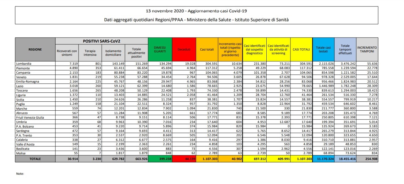Il numero di guariti si attesta a 399.238, +11.480 nelle ultime 24 ore. Il numero di attualmente positivi è in aumento, raggiungendo i 663.926 contro i 635.054 di ieri. Dall’inizio dell’epidemia, stando al bollettino di oggi, 13 novembre 2020, hanno contratto il Coronavirus 1.107.303 persone.