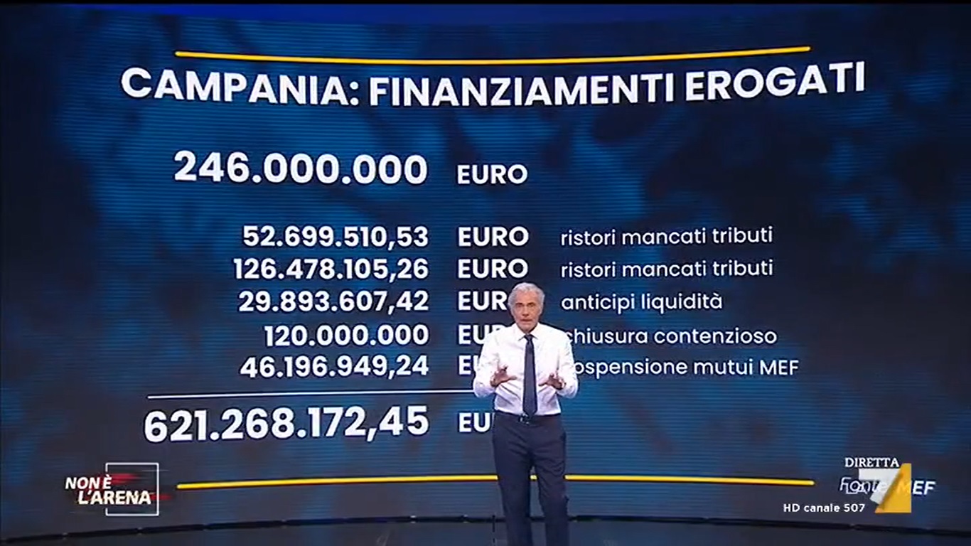 “Sono arrivati 246 milioni di euro però noi abbiamo scoperto ben altro cioè quello che è arrivato alla Regione Campania” – esordisce Giletti mostrando un tracciato.