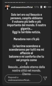 E ancora: “Le lacrime scendono e scenderanno per tutti ma mi affaccio al balcone e mi conforta che tu sei proprio lì come il Vesuvio, simbolo eterno della nostra città nel mondo.”