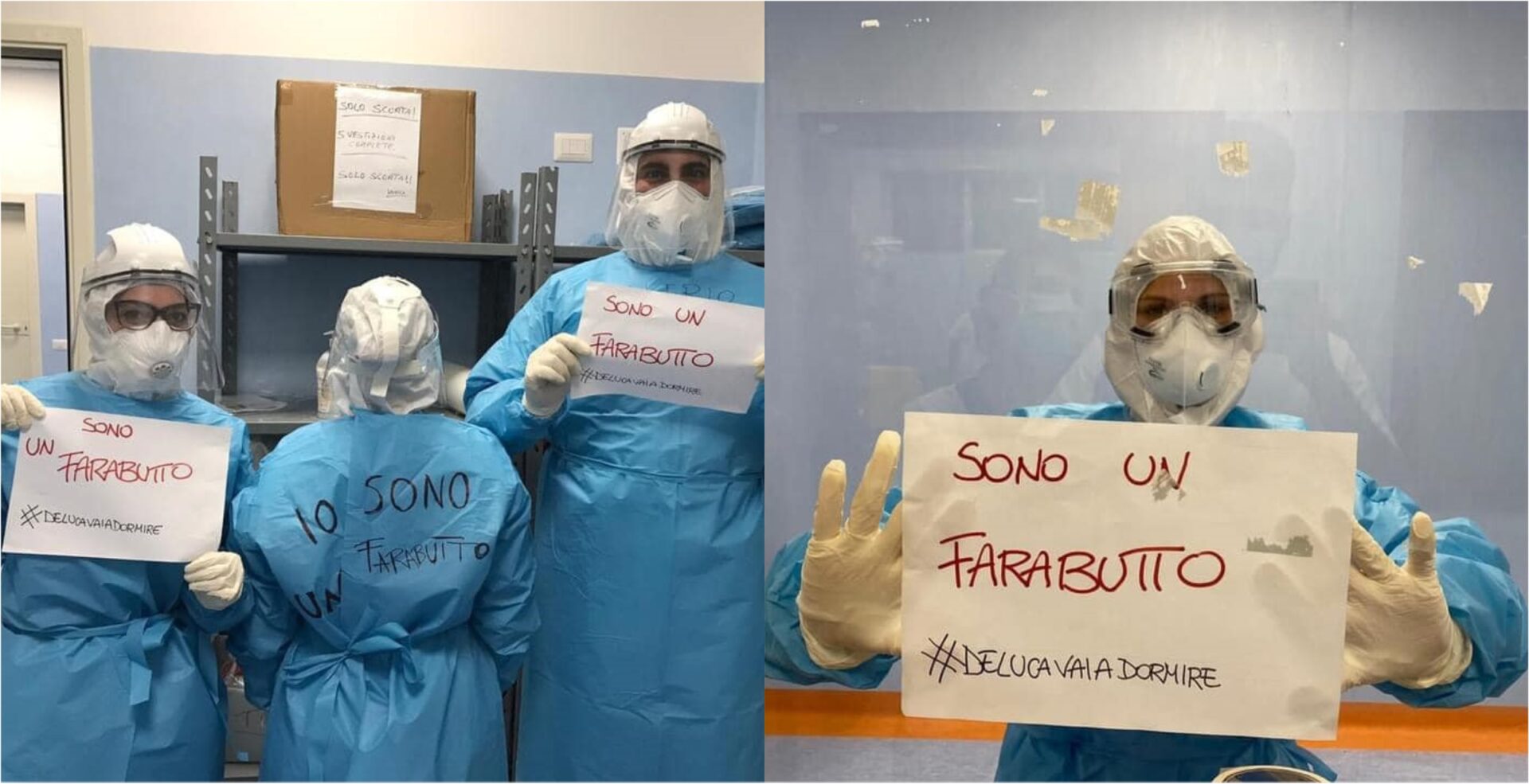 Infine c’è un’altra Anna che pubblica foto della “protesta” degli operatori sanitari contro De Luca, muniti di scritte sui propri camici e sui fogli mostrati con orgoglio alla telacamera.