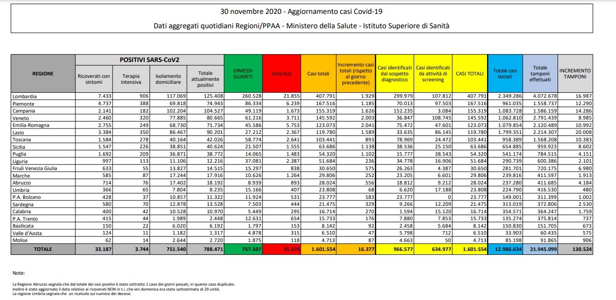 Il numero di guariti si attesta a 757.507, +23.004 nelle ultime 24 ore. Il numero di attualmente positivi è in calo raggiungendo i 788.471 contro i 795.771 di ieri (-7.300). Dall’inizio dell’epidemia, stando al bollettino di oggi, 30 novembre, hanno contratto il Coronavirus 1.601.554 persone.