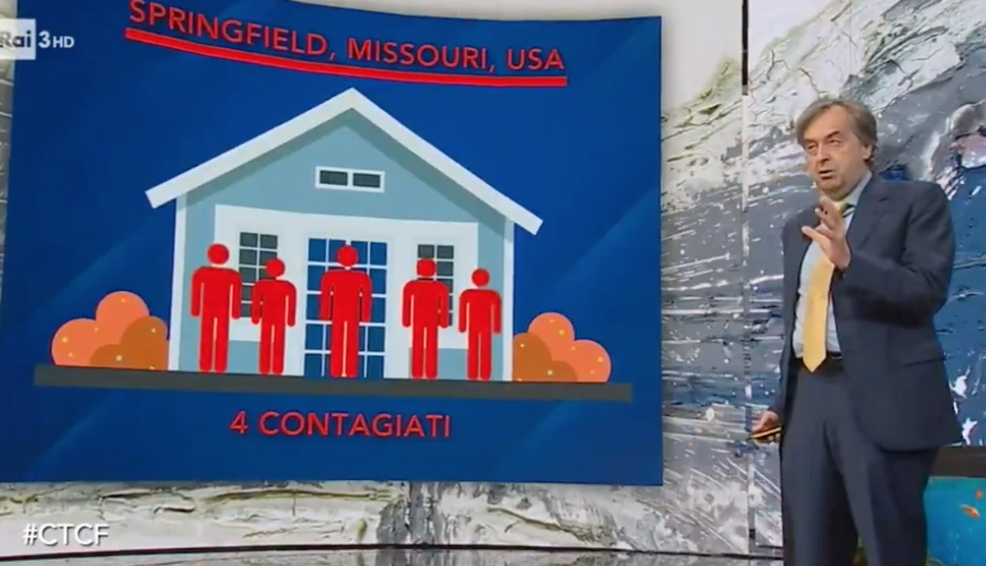 “Ci sono quelle piccoline che si chiama droplets, che cadono entro due metri. Poi ci sono altre molto più piccole, l’aerosol, dovete pensare a loro come a una nuvola di fumo che rimane sospesa nell’aria e può raggiungere distanze più ampie soprattutto in un ambiente chiuso. Per le goccioline più grandi, basta tenere una distanza di due metri. Per le più piccole, la questione è più complicata. Le dovete immaginare come il fumo che in una stanza può viaggiare, e come vi difendete? Aprite le finestre. La stessa cosa succede per l’aerosol, per questo è molto più difficile il contagio all’aperto”.