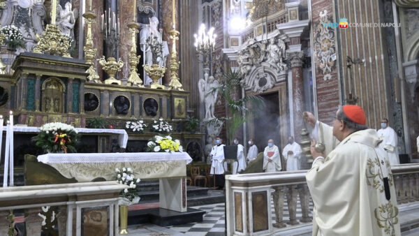 Prima dell’omelia, il Cardinale Sepe ha dichiarato: “Purtroppo sono le conseguenze di questo maledetto virus che sta distruggendo tutto ciò. Adesso bisogna limitarsi sotto tutti i punti di vista, anche quello religioso. Difatti non è possibile avviare la celebrazione qui in Piazza del Gesù, bisogna ridurre tutto all’interno della Basilica.”