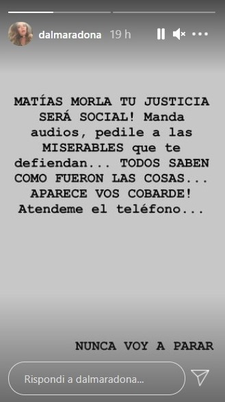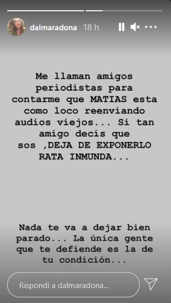La ragazza ha sbottato: “Mi hanno chiamato amici giornalisti per rivelarmi che Matias continua a mandare vecchi audio di mio padre. Se fosse davvero stato suo amico smetterebbe di esporlo in questo modo. Sei un topo immondo.”