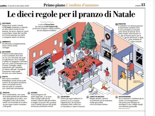 Stesso discorso per quanto riguarda gli avanzi. Se sono stati lasciati per lungo tempo sul tavolo, bisogna ricuocerli per uccidere i batteri e il virus. La settima regola riguarda il telefono: evitare di fare gli auguri passandosi lo stesso apparecchio, meglio usare il vivavoce. L’ottava regola riguarda invece i canti di Natale che vanno eliminati perché cantando si emettono goccioline che viaggiano più lontano. La nona regola riguarda gli asciugamani: meglio dare una salvietta personale. La decima regola è forse la più importante: bisogna evitare che nell’ambiente si diffondi il virus. Quindi è necessario cambiare ripetutamente l’aria, meglio lasciare un filo del balcone aperto.