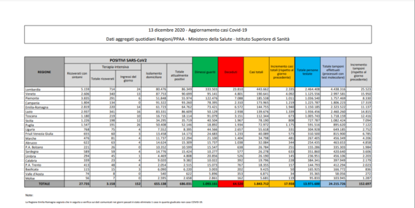 Il numero di guariti si attesta a 1.093.161, +16.270 nelle ultime 24 ore. Gli attualmente positivi sono nuovamente in aumento, raggiungendo i 686.031 contro i 684.848 di ieri (+1.183). Dall’inizio dell’epidemia, stando al bollettino di oggi, 13 dicembre, hanno contratto il Coronavirus 1.843.712 persone.