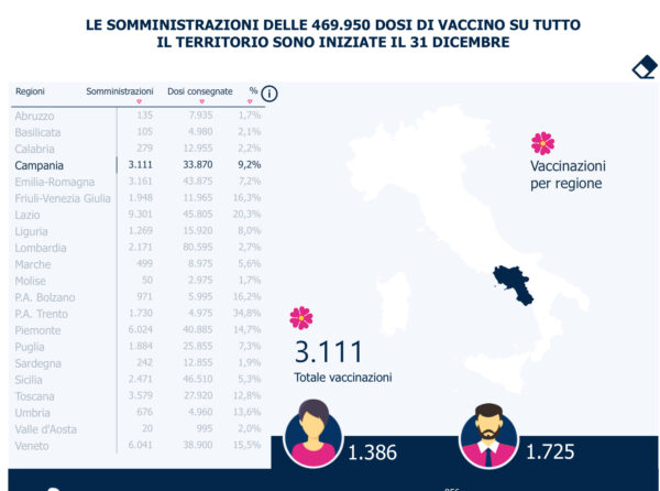 Mala la Lombardia che con 80.595 dosi arrivate (il numero più alto d’Italia) ha somministrato il vaccino appena al 2,7% della popolazione (2.171). Meglio fa la Campania con meno dosi arrivate (33.870) e 3.111 vaccinati (9,2%). Percentuali alte nel Lazio con 9.301 vaccinati (numero più alto di tutta Italia) su 45.805 dosi pari al 20,3% del totale arrivato.