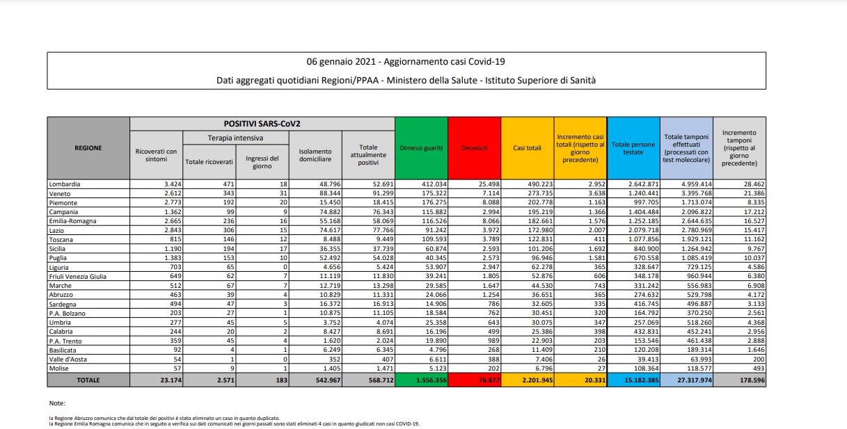 Il numero di guariti si attesta a 1.556.356, +20.227 nelle ultime 24 ore. Il numero di attualmente positivi è in calo raggiungendo i 568.712 contro i 569.161 di ieri (-449). Dall’inizio dell’epidemia, stando al bollettino di oggi, 6 gennaio, hanno contratto il Coronavirus 2.201.945 persone.