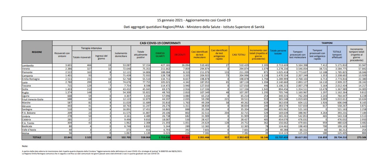Covid Italia: i contagi di oggi 15 gennaio