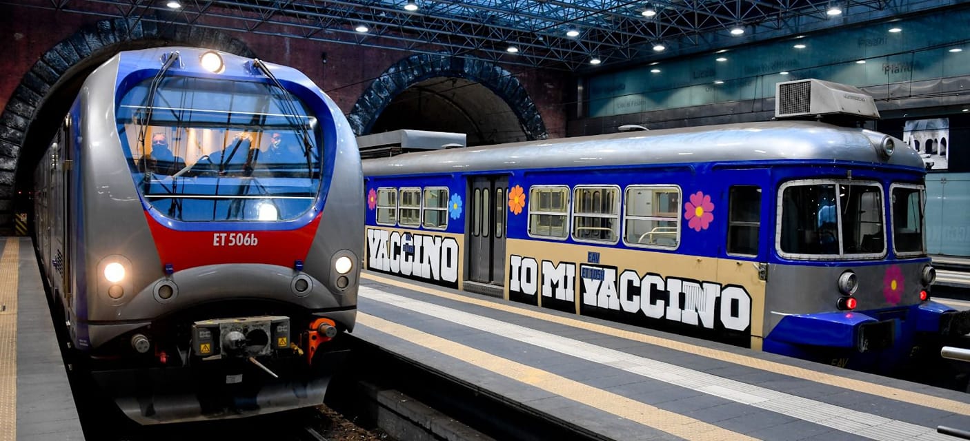I mezzi pubblici sono uno dei maggiori veicoli di trasmissione del virus e per questo motivo l’Eav, l’azienda che si occupa del trasporto nel Vesuviano e nelle zone flegree, ha deciso di mandare un messaggio chiaro. “Io mi vaccino” campeggia sul lato di un treno delle linee flegree della Cumana.