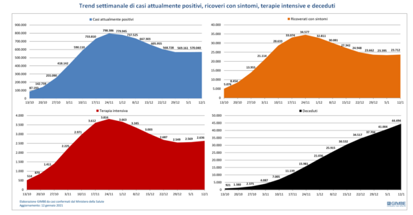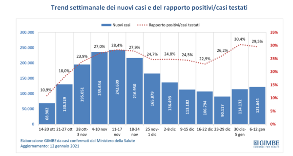 Il monitoraggio indipendente della Fondazione GIMBE conferma nella settimana 6-12 gennaio 2021, rispetto alla precedente, l’incremento dei nuovi casi (121.644 vs 114.132) a fronte di un lieve calo del rapporto positivi/casi testati (29,5% vs 30,4%). Stabili i casi attualmente positivi (570.040 vs 569.161) e, sul fronte ospedaliero, lieve risalita dei ricoverati con sintomi (23.712 vs 23.395) e delle terapie intensive (2.636 vs 2.569); ancora in aumento i decessi (3.490 vs 3.300). In dettaglio, rispetto alla settimana precedente, si registrano le seguenti variazioni: