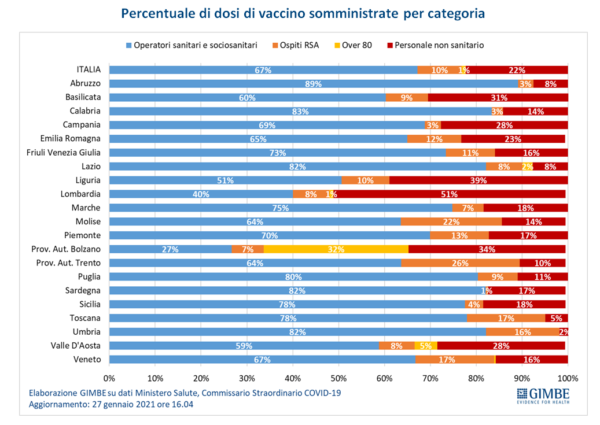 attilio fontana letizia morattiLa Fondazione Gimbe ha comunicato i risultati sul monitoraggio effettuato sulla somministrazione dei vaccini nelle diverse regioni italiane, registrando una disparità notevole e soprattutto delle apparenti incongruenze sulle categorie di persone che hanno ricevuto le prime dosi. La precedenza, formalmente, dovrebbe spettare infatti al personale sanitario ed agli ospiti delle RSA, ma abbiamo l’esempio della Lombardia che fino al 12 gennaio ha riservato il 51% delle dosi al personale non sanitario, il 40% a quello sanitario, 8% agli ospiti delle RSA e 1% agli over 80. Per personale non sanitario si intende tutte quelle figure, come per esempio il personale amministrativo, che non hanno titolo affinché rientrino nel personale sanitario.