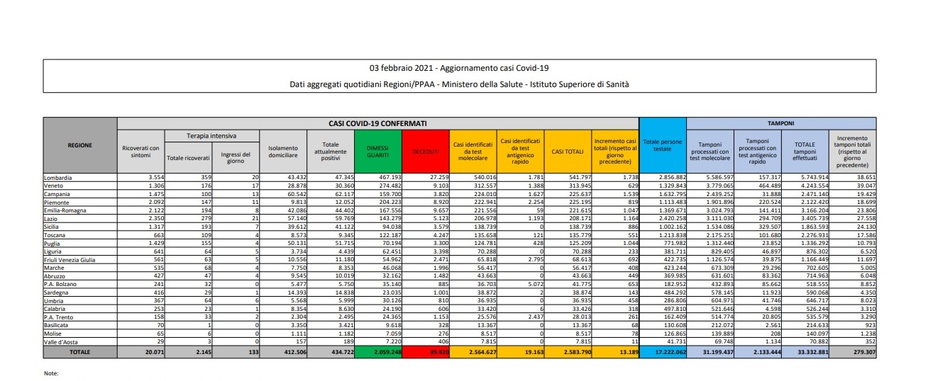Covid Italia: i contagi di oggi 3 febbraio 2021
