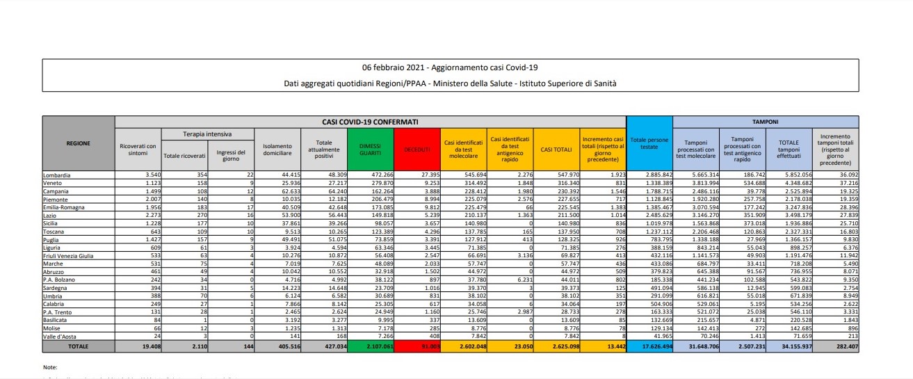 Covid Italia: i contagi di oggi 6 febbraio 2021