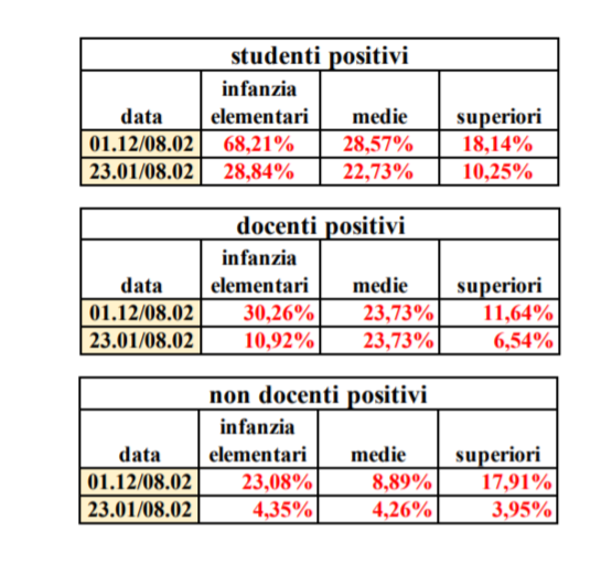 L’Asl Napoli 1 Centro mostra anche l’aumento dei casi dal 1 dicembre all’8 febbraio, ma soprattutto tra il 23 gennaio e l’8 febbraio, tenendo conto anche degli alunni o dei docenti che sono risultati positivi al Coronavirus non a scuola, ma in didattica a distanza. In percentuale è sempre la scuola dell’infanzia e primaria ad essere la più alta, anche perché i bambini di questi gradi di istruzione sono quelli da più tempo in classe.