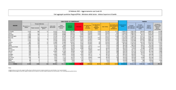COVID ITALIA: IL BOLLETTINO DI OGGI 13 FEBBRAIO