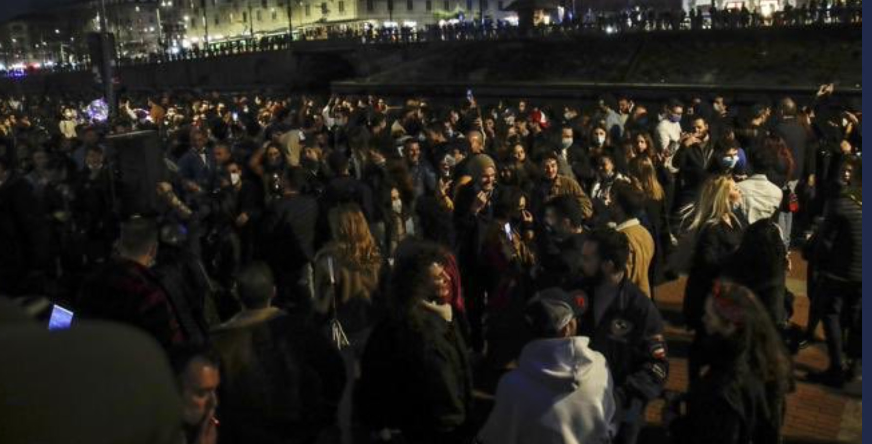 Il passaggio dalla zona gialla alla zona arancione ha scatenato i giovani di Milano. Una folla di adolescenti, quasi tutti senza mascherina, si è riunita sulla Darsena con balli e birra in mano. Immagini che hanno scandalizzato il mondo politico e che hanno spinto il sindaco Sala a giustificarsi per i mancati controlli. Il video della discoteca a cielo aperto sui Navigli, titolo d’apertura del Tg1 di oggi, mostra come tutta Italia, da Nord a Sud, sia caratterizzata da persone irresponsabili che violano le regole anti contagio. Soltanto domenica scorsa infatti sui media erano girate le foto e i filmati del lungomare di Napoli con assembramenti e folla. Episodi quindi che non accadono solo nella città partenopea.