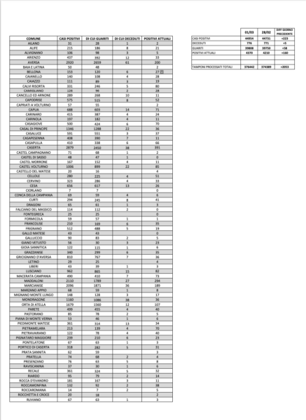 L’Asl di Caserta ha lanciato l’allarme. In un documento, diffusosi sui social in diversi gruppi, ha indicato 27 Comuni della zona in cui bisogna agire rapidamente con misure di contenimento più restrittive. Non si tratta di una zona rossa, che può essere predisposta solo dal presidente del Consiglio, dal governatore o dai sindaci, ma di un suggerimento. L’Asl infatti invita i primi cittadini a emanare ordinanze più restrittive come la chiusura di alcuni negozi non essenziali o la riduzione dell’orario. A questi si aggiunge la sospensione dell’attività scolastica in presenza già attuata da De Luca. Preoccupano i contagi in aumento nell’ultima settimana (22-28 febbraio) anche se i numeri sono ancora inferiore rispetto alla seconda ondata.