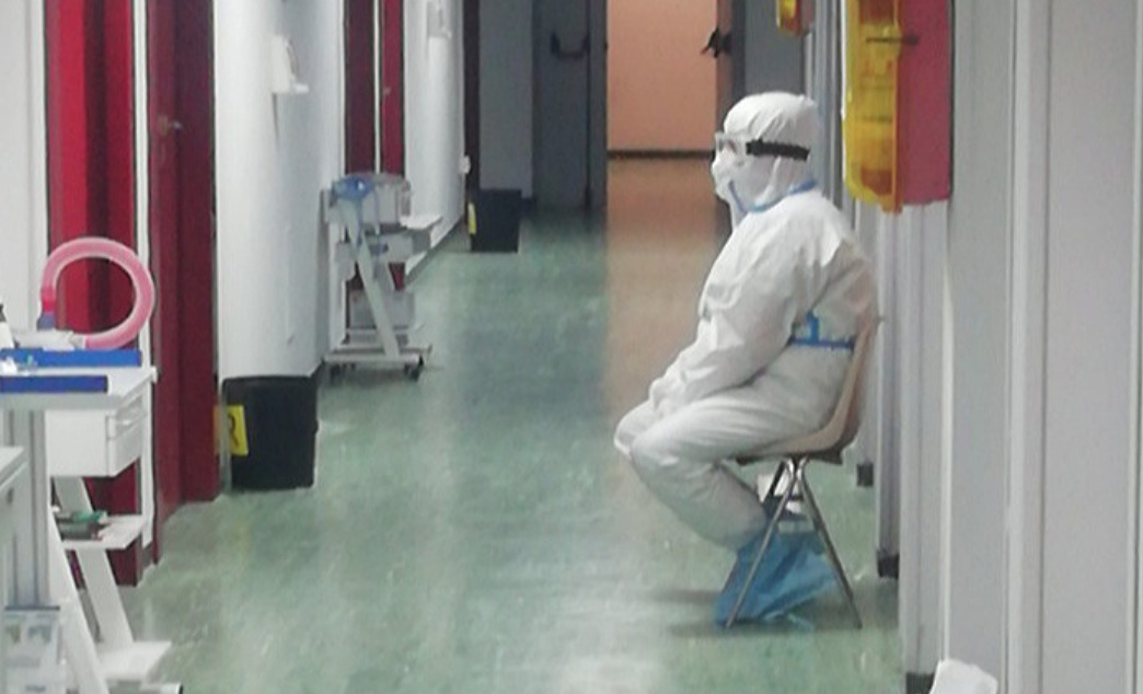 Dentro la tuta potrebbe esserci un uomo o una donna. Dopo un turno di lavoro, alle 4 di notte, il sanitario decide di sedersi su una sedia. Magari sta pensando alla sofferenza dei pazienti intubati, a chi non ce l’ha fatta e a chi invece spera di salvare. Un attimo di smarrimento e di vuoto che fa trapelare anche l’emozione di chi ci protegge.