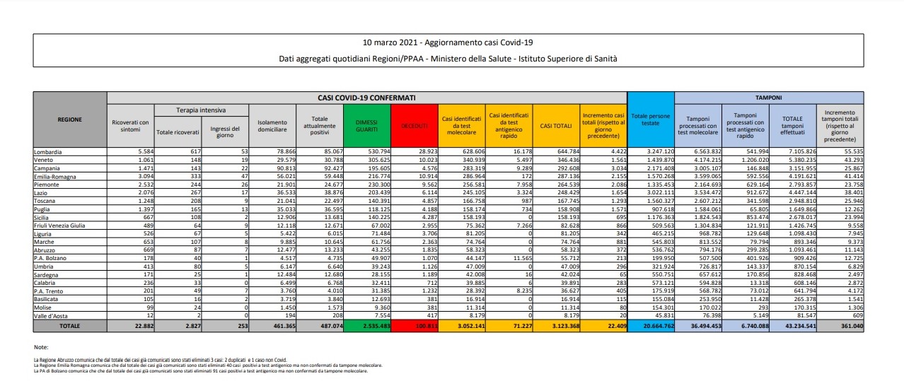 Degli attualmente positivi totali, 461.365 persone si trovano in isolamento domiciliare. Dall’inizio dell’emergenza sanitaria, stando al bollettino di oggi, martedì 10 marzo 2021, hanno contratto il coronavirus 3.123.368 persone in Italia. In generale, rispetto a ieri, si assiste ad un aumento del tasso di positività e il numero dei contagiati torna a superare la temuta soglia dei 20.000. Peggiora anche il dato relativo alle terapie intensive: il bollettino di ieri riportava un incremento di 56 unità, oggi sono ben 76 i nuovi pazienti.
