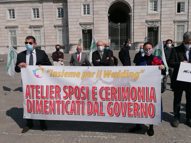 «Dateci una data, vogliamo lavorare. I ristori non bastano, non li vogliamo». E’ il grido disperato sollevato dal mondo del wedding questa mattina di fronte alla Reggia Di Caserta. Un flash mob che ha coinvolto l’intero Paese, da Nord a Sud, grazie alla rete “Insieme per il wedding”. Presente al corteo pacifico anche la nota wedding planner Cira Lombardo, Confesercenti Caserta, l’Associazione Fotografi Videografi Professionisti, agenzie di viaggio, parrucchieri e tutti coloro che da oltre un anno sono fermi.