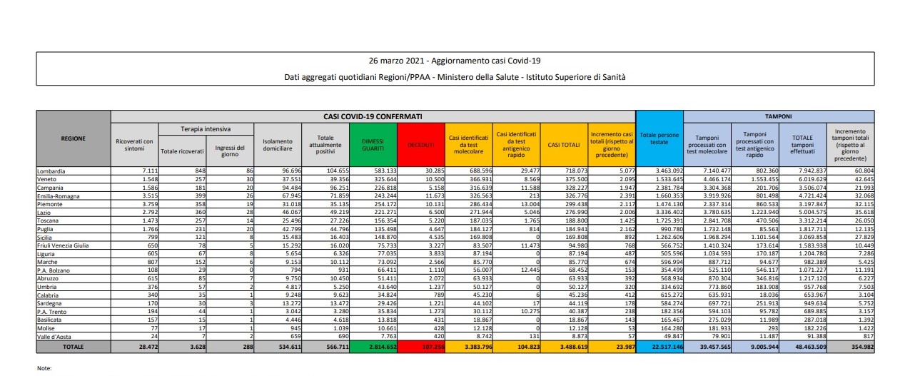 Covid Italia, il bollettino di oggi 26 marzo 2021 – Il Ministero della Salute, che quotidianamente aggiorna sui casi di positività al coronavirus in Italia, ha diffuso i dati di oggi. Sono 23.987 i nuovi positivi a fronte di 354.982 tamponi effettuati. La percentuale di positivi è del 6,75%, stabile rispetto a ieri quando si attestava al 6,78%.