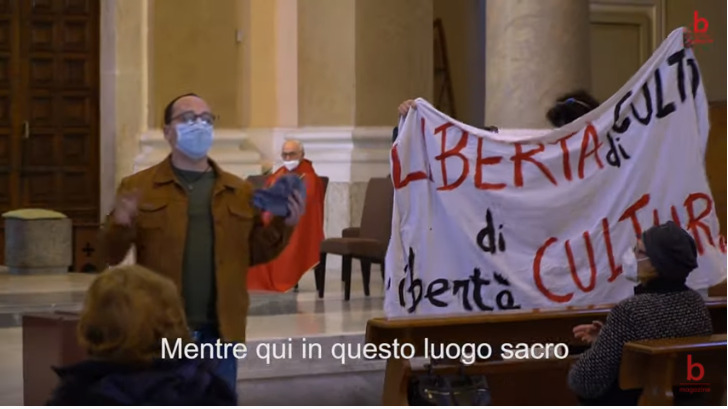 Tra lo sgomento dei presenti e le richieste del parroco di allontanarsi, un ragazzo si è alzato per dire il suo di “sermone” mentre altre persone hanno esposto uno striscione con scritto: “Libertà di culto, libertà di cultura“. Il tutto è stato ripreso da un video girato da “bMagazine” che sta già spopolando sul web.