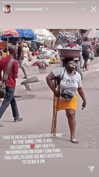Victor Osimhen ha lanciato un appello su Instagram per trovare una ragazza con disabilità. L’attaccante del Napoli si è imbattuto nella foto di una giovane donna che svolge il suo lavoro, vendere bottiglie d’acqua, nonostante abbia una sola gamba. Una disabilità che le rende sicuramente tutto più difficile, ma come si vede nelle foto, lei non si scoraggia e con la sua stampella gira per il mercato della sua città e si guadagna quei pochi spiccioli.
