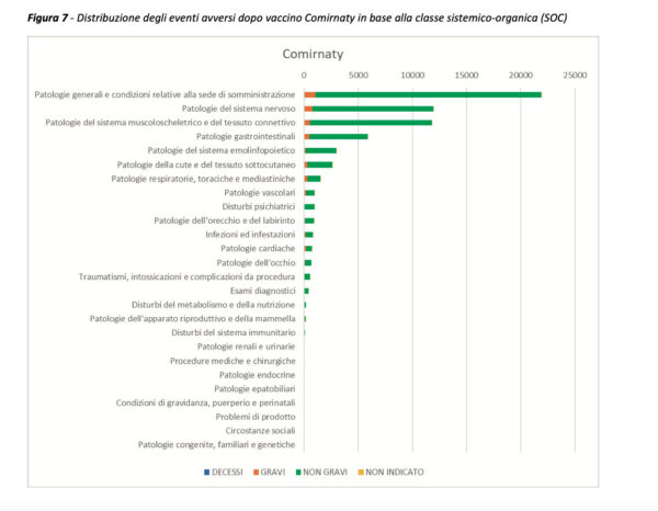 Il 93,6% ha avuto però sospette reazioni avverse non gravi (come febbre, mal di testa e stanchezza), il 6.1% gravi dopo le somministrazioni del vaccino. Per gravi si intende se ha comportato ospedalizzazione/ricorso al pronto soccorso, pericolo immediato di vita, invalidità, anomalie congenite, decesso o altra condizione clinicamente rilevante. In totale si è registrato un tasso di 44 eventi gravi ogni 100.000 dosi somministrate, indipendentemente dal tipo di vaccino, dalla dose somministrata (1a o 2a dose) e dal possibile ruolo causale della vaccinazione.