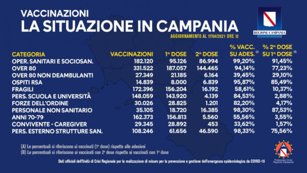 La Regione, nel consueto aggiornamento quotidiano, comunica inoltre che la piattaforma per le adesioni è regolarmente aperta per tutte le categorie previste, e trasmette il prospetto con i dati delle vaccinazioni effettuate in Campania fino a oggi, sabato 17 aprile, e divise per categoria.
