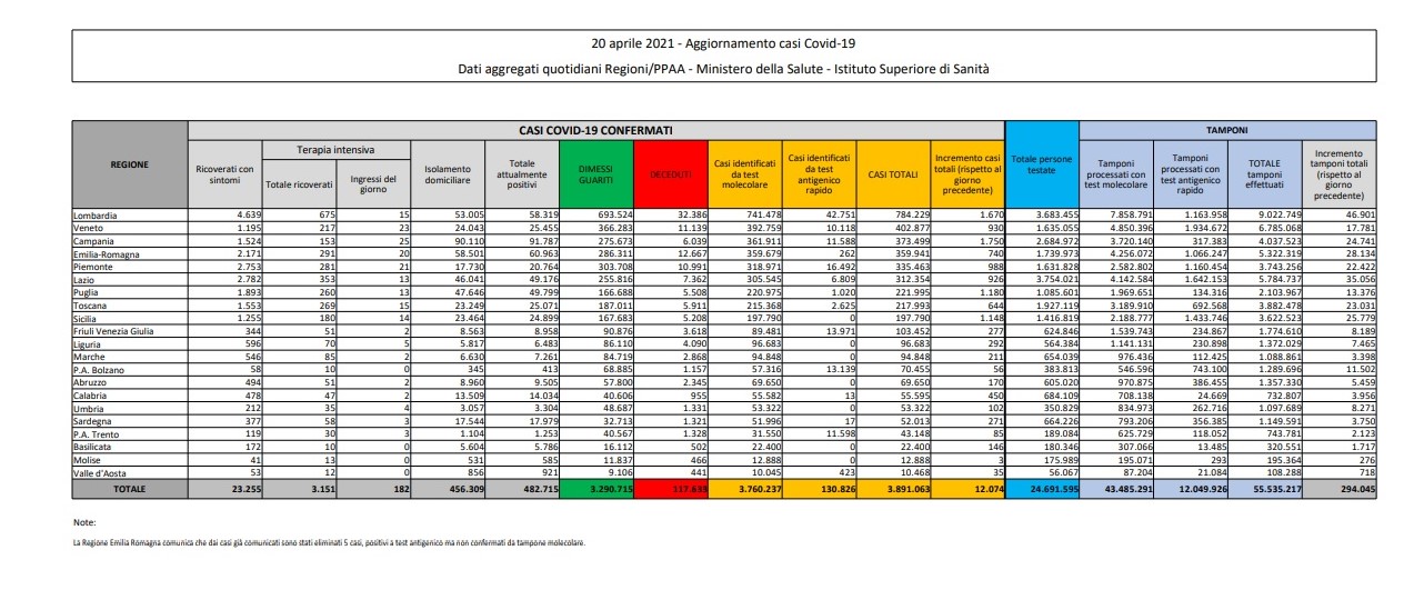 Covid Italia, il bollettino di oggi 20 aprile 2021 – Il Ministero della Salute, che quotidianamente aggiorna sui casi di positività al coronavirus in Italia, ha diffuso i dati di oggi. Sono 12.074 i nuovi positivi a fronte di 294.045 tamponi effettuati. La percentuale di positivi è del 4,1%, di nuovo in aumento rispetto a ieri quando si attestava al 3,85%.