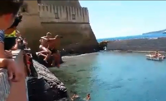 Una volta il Lungomare di Napoli era caratterizzato da una lunga spiaggia, sulla quale si affacciava la Villa Comunale, che ai tempi di Ferdinando I si chiamava Real passeggio di Chiaja”, e la Riviera di Chiaja era davvero una riviera. Successivamente, con i Savoia, Napoli ha conosciuto l’era delle colate a mare che hanno sostituito il cemento alla sabbia, ma i Napoletani non si fanno scoraggiare e il bagno se lo fanno lo stesso. Se al piccolissimo Lido Mappatella è molto difficile trovare spazio, c’è chi si tuffa dal pontile di collegamento tra la terraferma e Castel dell’Ovo, approfittando della balneabilità di gran parte del mare napoletano. Ecco il video di un gruppo di amici che si immergono nelle acque antistanti al più antico castello di Napoli.