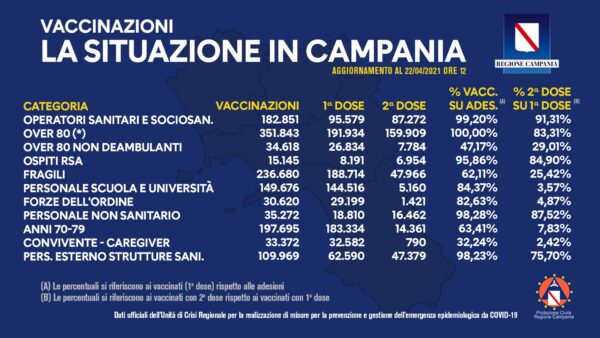 L’Unità di Crisi della Regione Campania, come di consueto, ha diffuso il bollettino dei vaccini effettuati, aggiornato alle 12 del 22 aprile 2021. Complessivamente sono stati vaccinati con la prima dose 982.283 cittadini (+15.964). Di questi 395.458 hanno ricevuto la seconda dose (+17.269). Le somministrazioni effettuate sono state, in totale, 1.377.741, +33.233 rispetto a ieri.