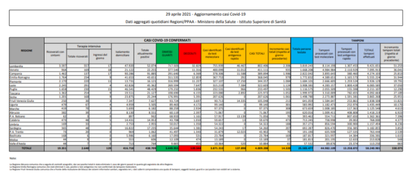 Covid Italia – il bollettino di oggi 29 aprile